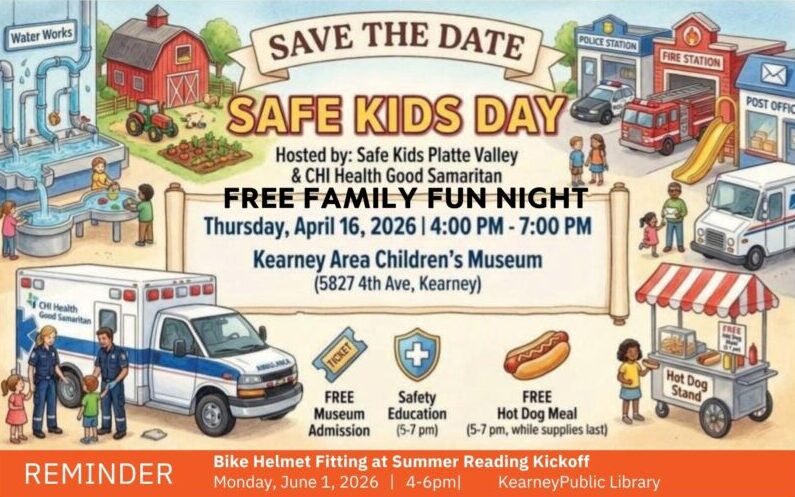 Join us for FREE evening into Kearney Area Children’s Museum with Safe Kids Platte Valley & CHI Health from 4-7PM as we learn about summer safety tips with water, helmets, and more! Enjoy a free hotdog meal and special activities from 5-7PM!