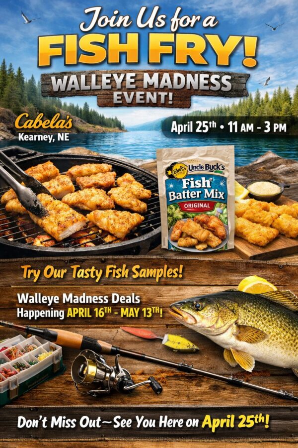 Join us at the store on April 25th from 11a – 3p (or until gone) for an event you won’t want to miss – our Fish Fry as part of Walleye Madness. Bring your friends, bring your appetite, and make a day of it. Come hungry and enjoy fresh fish grilled on-site, seasoned with the delicious Bass Pro Shops Uncle Buck’s Fish Batter Mix – we’ll have samples ready for you to try and options available to buy. Don’t miss out – we’ll see you on the 25th for some awesome Fish Frying Fun!